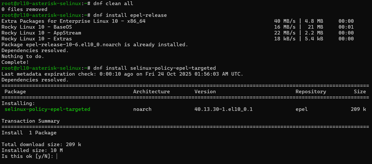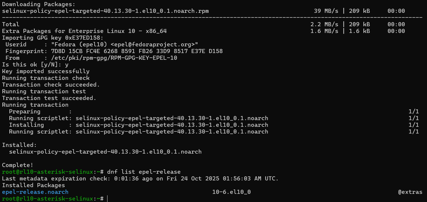 Thanks for your help Michael, however I can't see selinux-policy-epel-targeted. The output is as follows. Am I doing something wrong? [root@dev-rocky-10 ~]# dnf list epel-release Last metadata expiration check: 0:47:47 ago on Fri 24 Oct 2025 13:59:00. Installed Packages epel-release.noarch 10-6.el10_0 @extras [root@dev-rocky-10 ~]# dnf install selinux-policy-epel-targeted Last metadata expiration check: 0:47:51 ago on Fri 24 Oct 2025 13:59:00. No match for argument: selinux-policy-epel-targeted Error: Unable to find a match: selinux-policy-epel-targeted |