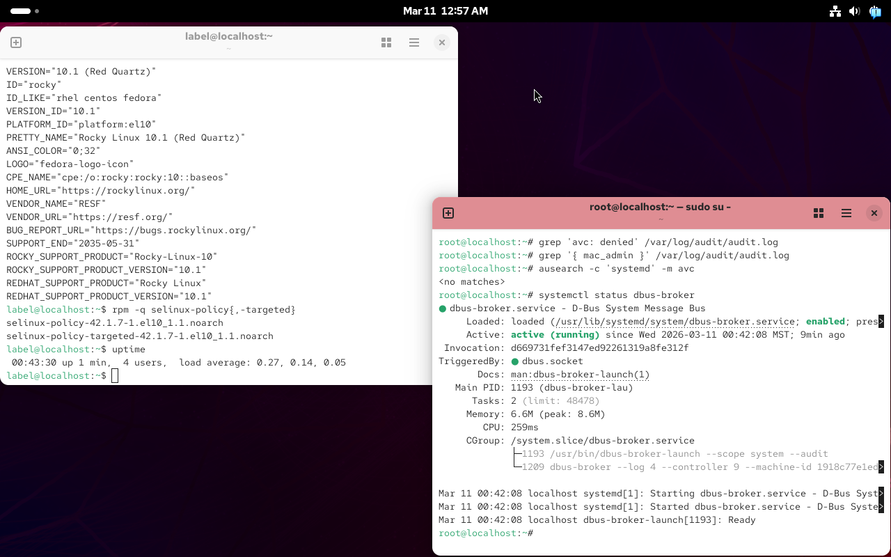 | Additional Information | Rocky Linux 10.1 systemd-257-13.el10.rocky.0.1 dbus-broker-36-4.el10 SELinux enforcing | ||||