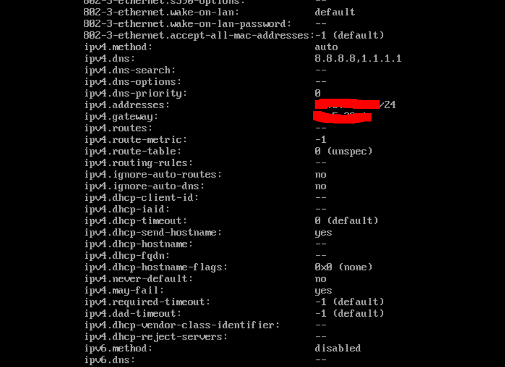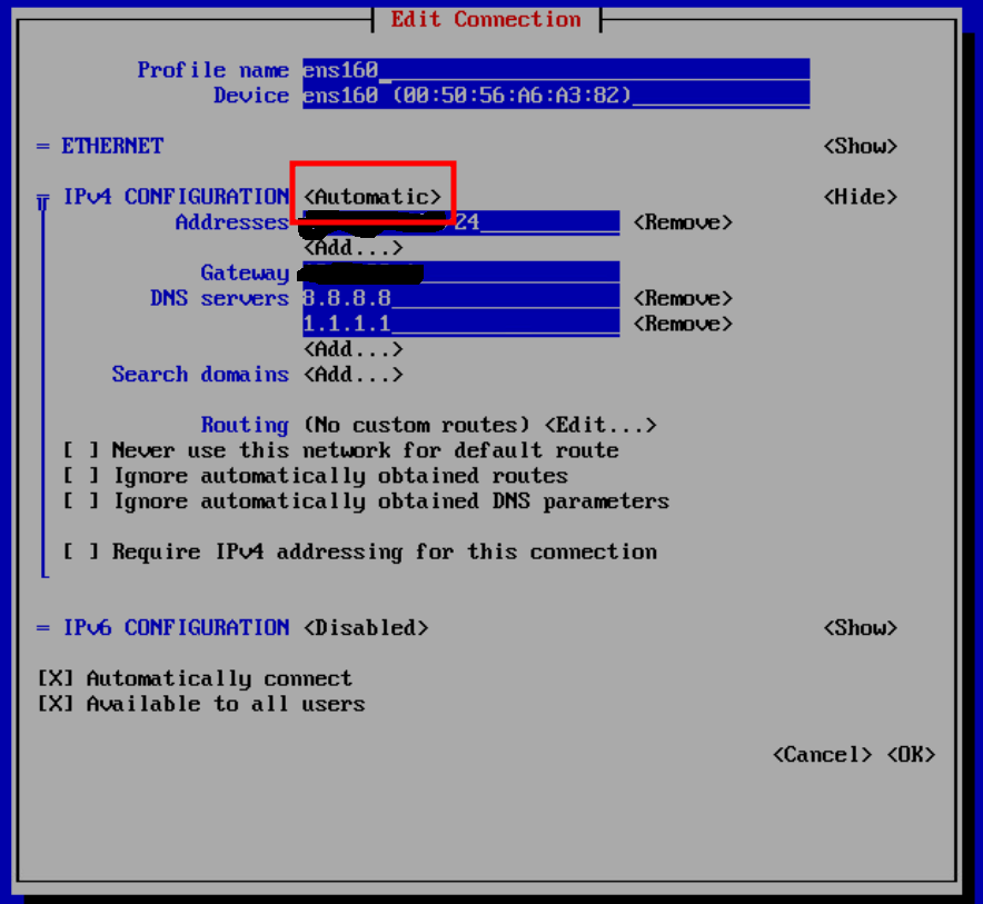 I continued investigating. Today I had a freshly installed RockyLinux 8.6, network wasn't configured during install. I've fired nmtui and did manual configuration. On purpose I've keep automatic and provided manual configuration parameters (IP/Mask, default gateway and DNS). Got the same behaviour. Did screenshots that attached to this note. I'm now thinking that this might be a network-manager Issue, not an Installer bug. |