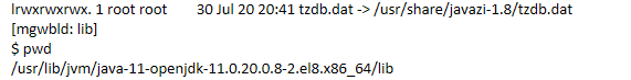 Hi, I actually encountered the same issue, when upgraded from: $ java --version openjdk 11.0.19 2023-04-18 LTS OpenJDK Runtime Environment (Red_Hat-11.0.19.0.7-2) (build 11.0.19+7-LTS) OpenJDK 64-Bit Server VM (Red_Hat-11.0.19.0.7-2) (build 11.0.19+7-LTS, mixed mode, sharing) to: $ java --version openjdk 11.0.20 2023-07-18 LTS OpenJDK Runtime Environment (Red_Hat-11.0.20.0.8-1) (build 11.0.20+8-LTS) OpenJDK 64-Bit Server VM (Red_Hat-11.0.20.0.8-1) (build 11.0.20+8-LTS, mixed mode, sharing) $ pwd /usr/lib/jvm/java-11-openjdk-11.0.20.0.8-2.el8.x86_64/lib lrwxrwxrwx. 1 root root 30 Jul 20 20:41 tzdb.dat -> /usr/share/javazi-1.8/tzdb.dat but /usr/share/javazi-1.8/tzdb.dat doesn't exist. It causes: Exception in thread "main" java.lang.Error: java.io.FileNotFoundException: /usr/lib/jvm/java-11-openjdk-11.0.20.0.8-2.el8.x86_64/lib/tzdb.dat (No such file or directory) Separately installing 'tzdata-java' solves the issue, but why was it changed in the first place? Regards |