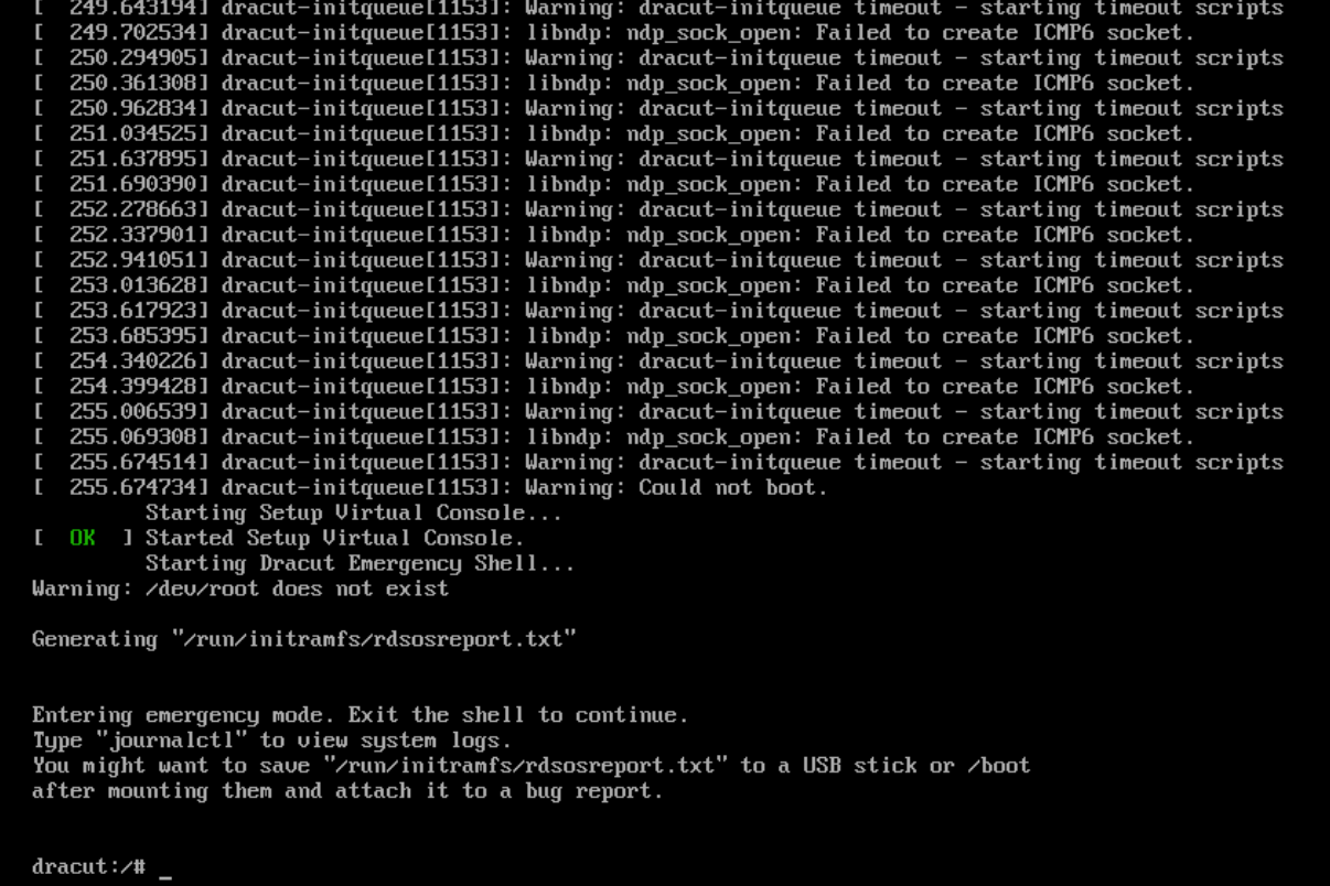 "dracut-initqueue[1245]: libndp: ndp_sock_open: Failed to create ICMP6 socket"